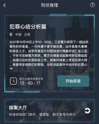犯罪大师犯罪心结分析篇答案怎么解析,这个是今日更新的一个全新的剧本,难度是三星,怎么参与其中解答呢,下面就来介绍下犯罪大师犯罪心结分析篇答案是什么。