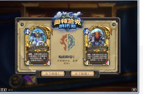 1.选择部落和联盟能够获得不同的奖励,选择部落可以获得德雷克塔尔,而选择联盟就能够获得范达尔?雷矛,这两场卡牌非常的让人难以取舍