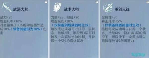 天赋设置上,剑盾半肉输出流只需要点出属于剑盾的经典三天赋即可。武器大师提供给我们的剑盾半肉输出流角色高达百分之20的残血斩杀能力,很大程度上增加了剑盾的输出效率。而战术大师的解控和霸体效果是毋庸置疑的PVP神技,搭配上受身玩家能够减免PVP战场里大部分控制效果。最后重剑无锋弥补了剑盾角色的综合输出能力,这和我们追求输出的剑盾半肉输出流的主旨是一模一样的,所以剑盾经典三天赋就非常适合我们剑盾半肉输出流。
