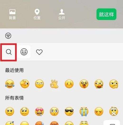 4、随后可以看到表情界面中会有一个放大镜就是搜索表情的功能,点击去搜索【农场】;