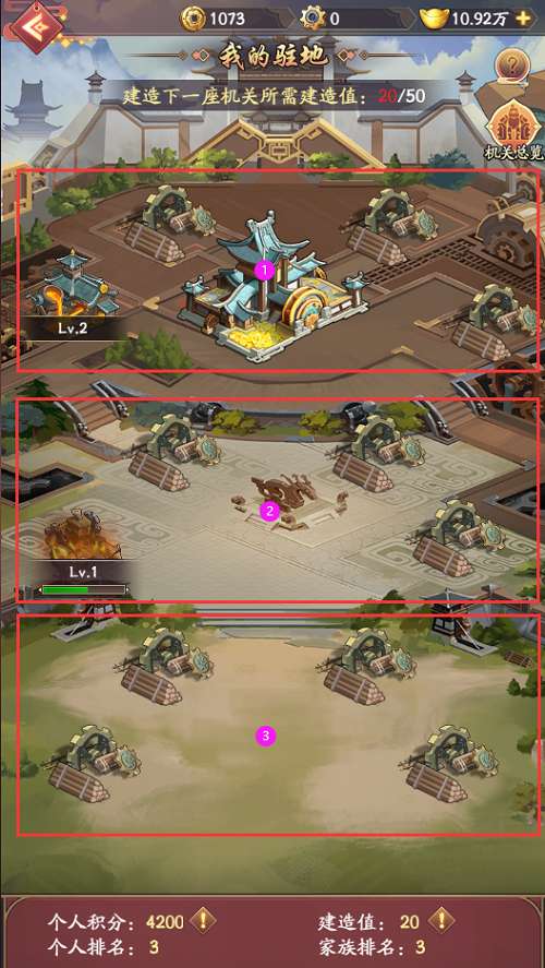 ①驻地区域:上中下分别对应资源区域、攻城区域、防守区域。