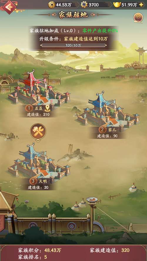 ①家族驻地等级:家族建造值等于所有家族成员建造值总和;驻地等级越高,家族成员工匠铺锻造速度越快。