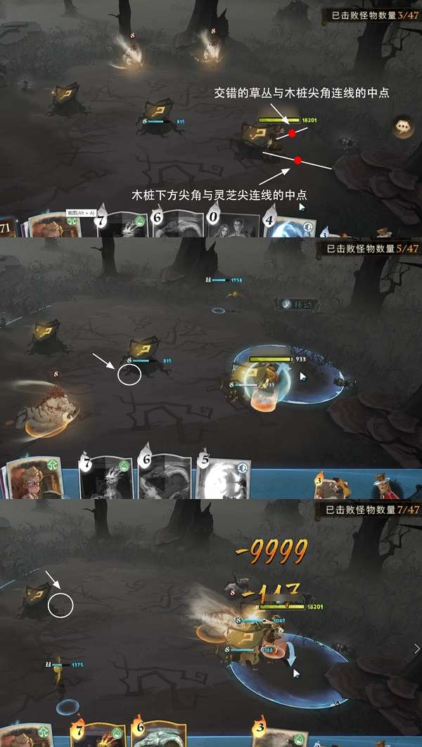 2.点击草丛与木桩尖角连线的中点释放随从显形,迅速点击中间木桩下方位置,不要乱动,接下来等技能cd结束就搬完了。