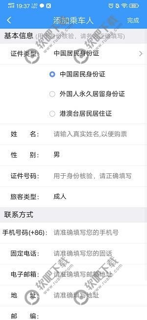 5、进入之后将新乘客的证件信息以及联系方式等资料,填写完毕后点击界面右上角的完成即可。