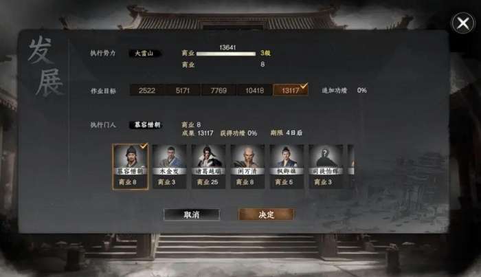 富贾阁作为核心财源建筑,每级提升可带来20%的商业收入增幅(满级10级可达每日5000铜币基础收益)。建议优先将其升至5级,解锁"商路拓展"功能后,派遣魅力值80+的弟子进行贸易,单次往返可额外获利3000-8000铜币。