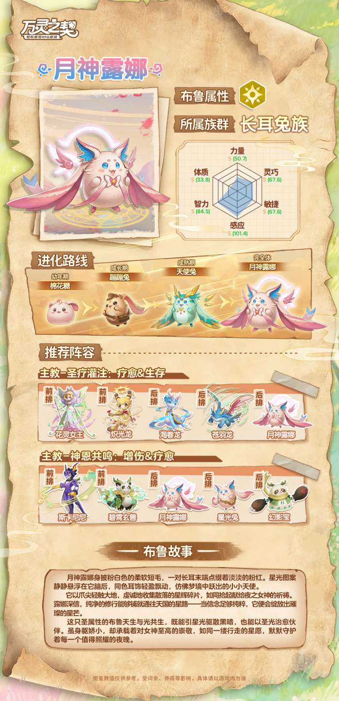 月神露娜是夜穹下的虔心巡礼者,被誉为“行走星愿”。它拥有【圣疗灌注】与【神恩共鸣】两条进化路线,能为核心阵容提供强大的疗愈与增益,是兼具生存与辅助的优雅存在。下面是万灵之契月神露娜布鲁图鉴,包含角色基础信息进化路线及推荐阵容。