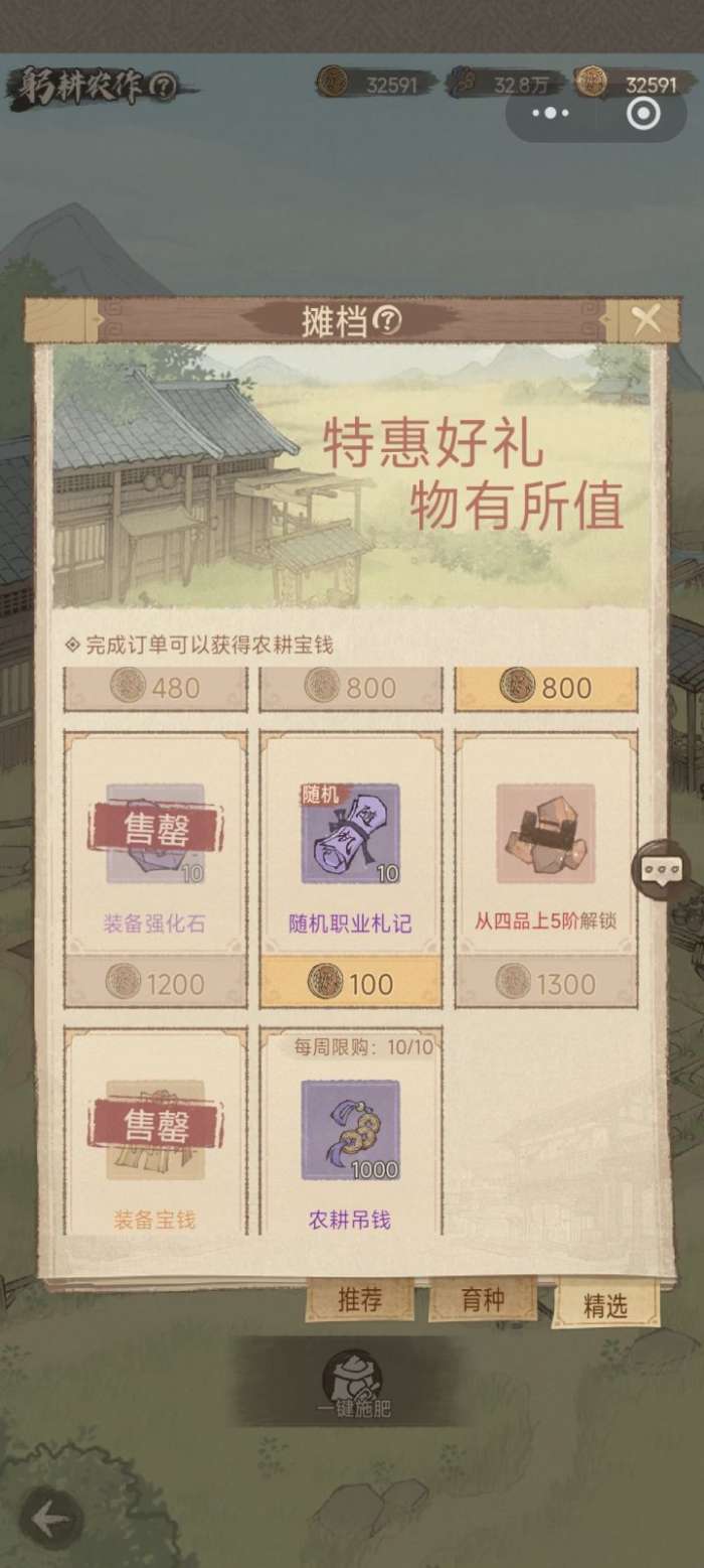 折扣商品:遇到2折的种子,或者“小筑建木”(苗圃升级用的材料),不用犹豫,直接买,血赚不亏;5折的就看手里的吊钱够不够,不够就先不买,别乱花钱。