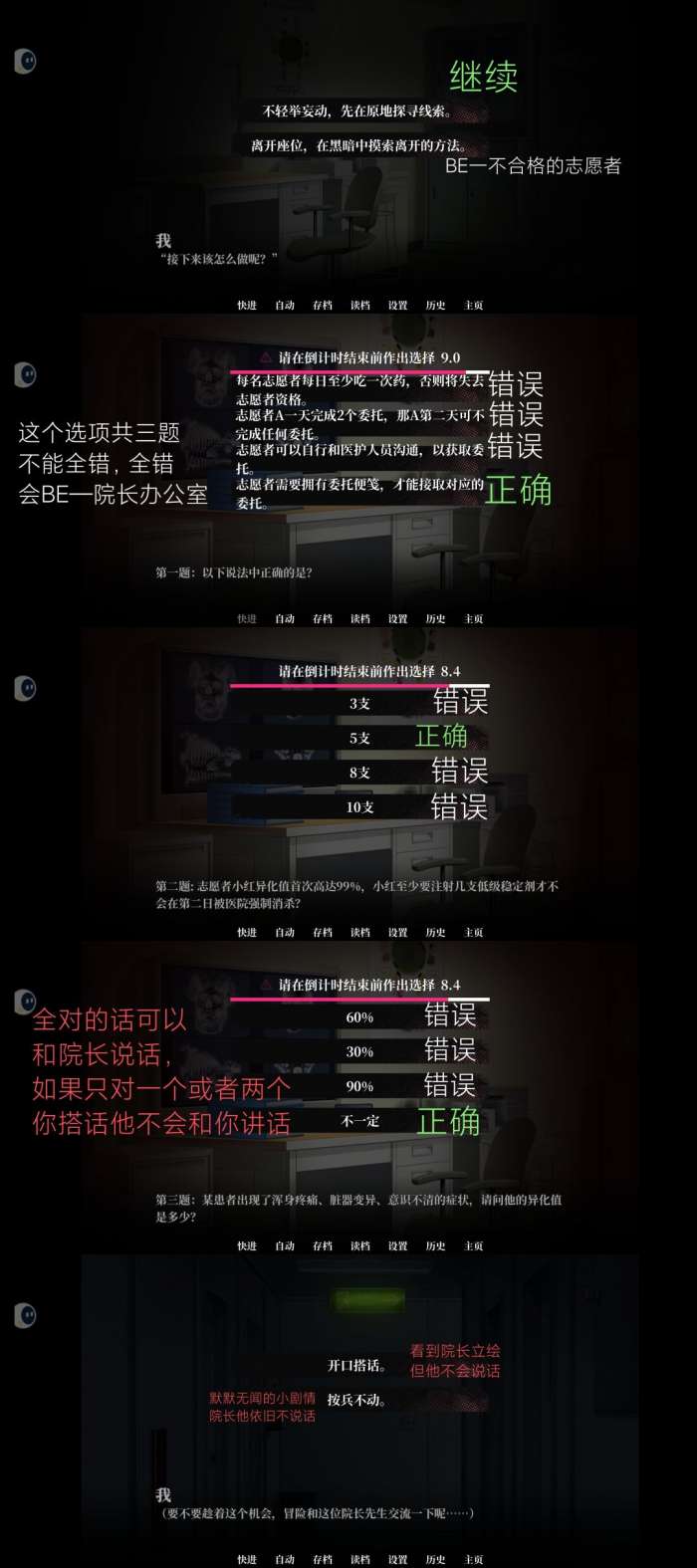 我的恋爱逃生攻略第四爱心医院1-4章怎么玩,限时选项全对:42432,志愿者需要拥有委托便笺,才能接取对应的委托,全对的话可以,和院长说话如果只对一个或者两个,你搭话他不会和你讲话。