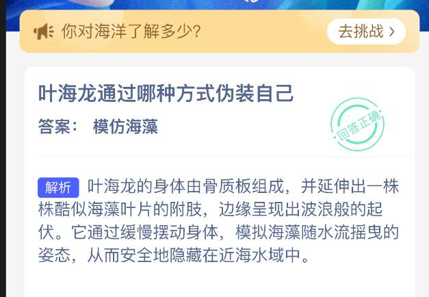 叶海龙通过哪种方式伪装自己?【神奇海洋】2026年2月24日新题目已开答!正确答案现已公布,点击领取拼图,一起为修复海洋生态贡献力量!今日正确答案是:【模仿海藻】。叶海龙通过模仿海藻方式伪装自己。