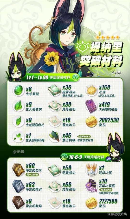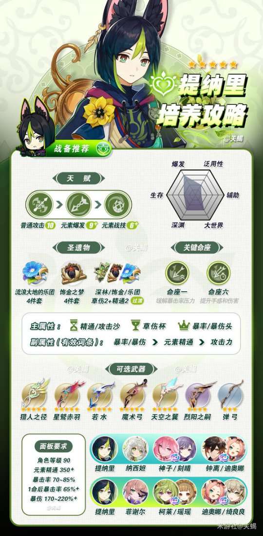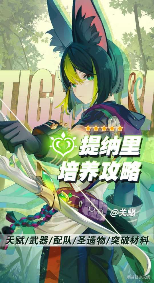 「提纳里」5星草元素弓系角色,定位短轴速切爆发C,对单强对群弱,以施放元素战技后3连重击和元素爆发为主要输出方式,并且元素战技可快速嘲讽敌人创造输出环境;最佳队友仍是八重神子和纳西妲,适合打雷草蔓激化反应,所以提纳里的元素精通很重要,与攻击力收益接近;成型很依赖高强度武器和适配的队友,例如专武和纳西妲2命,而且面板要求也很严格,否则输出效果达不到期望标准。