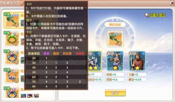 试炼之塔:爬塔每日奖励,爬塔层数越高,掉落品质越好。卡片融合:低阶合高阶(等级越高,概率越低)。