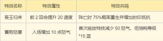 【吾王归来】:核心增益为战斗前2回合额外提升20点速度,助力角色抢占先手控场权,为封印敌方核心单位、衔接团队战术奠定基础。