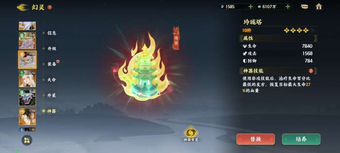 三个奶妈的装备推荐都是三生命套,主词条全部生生生,副词条速度>效果抵抗>生命,如果对面控制多可以带生命➕抵抗套 神器推荐带广寒琼玉 玲珑塔