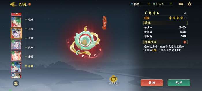 装备推荐无论前中后期都是速度套➕暴击套或者速度➕命中,主词条速度鞋 暴击或者攻击玉佩 攻击戒指或者命中戒指都可以,主要是看自身副词条缺什么属性来安排, 副词条推荐速度>效果命中>暴击=攻击 神器推荐天丝灵纱,最适合的群伤神器,平民玩家的不二之选,抽就完事了