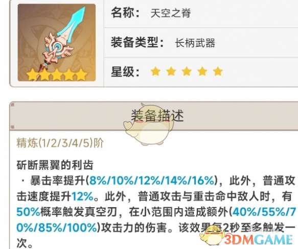 1、天空之脊作为充能类武器,有着较高的泛用性,特效还能够提供暴击率和重击伤害。