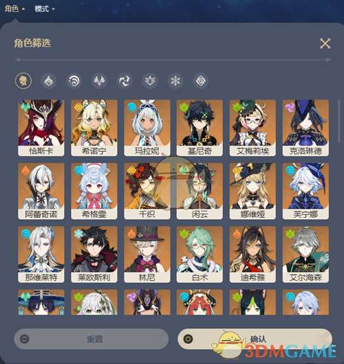 2、在角色筛选页面,可以按照元素分类来筛选角色;