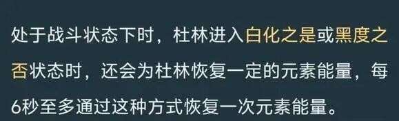 原神6.2杜林V4版本情况出来了,大家可以翻看昨日文章,这里给个总结,就是杜林的前台火的大招伤害增强了10%,而削韧了后台能力。且不看具体数值情况,毕竟影响实际战斗情况不大。不过唯一让人不爽的就是,杜林的大世界能力被砍了:处于战斗状态下,杜林进入白化或者黑度状态时,会恢复一定的元素能量。说白了,就是非战斗状态下,不回能。
