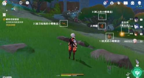 1、接受任务后,玩家需沿地图的东侧行进,抵达枯木之中,搜集火神瞳。随后,依照任务提示,分别与场景中的三只小嵴锋龙进行交流。