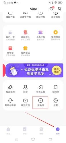 1、进入丁香妈妈app后,首先点击右下角“我的”,再将页面下拉,点击“兑换码”选项;