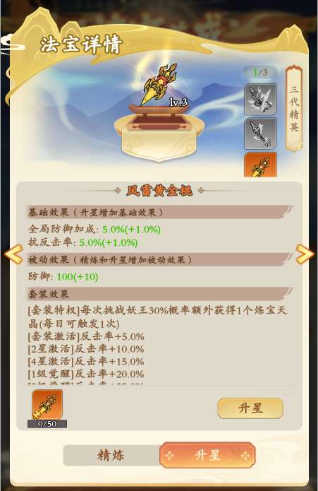 升星需要消耗法宝碎片,升星不仅可以提升属性,还可以强化套装效果,大幅提升战力。