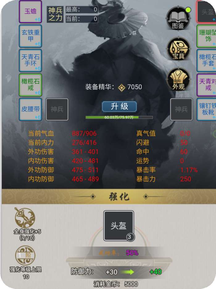 2、前期跟主线会卡战力,不让过图,这时候一定要礼包码送的元宝 商场购买强化石,全身先加3,一半后面就不会再卡图,本事强化后给的属性加成也很多,前期无压力了,强化是强化部位,不会因为更好装备而失效,非常良心了。