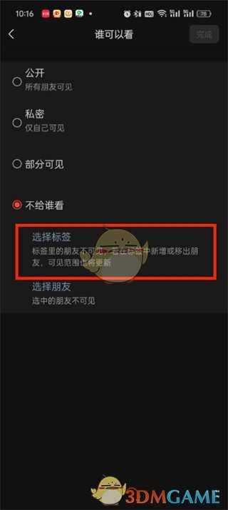 5、在谁可以看的页面中我们点击【不给谁看】之后,我们在点击【选择标签】;