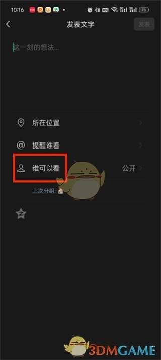 4、之后进入到发表朋友圈的页面中可以设计者所在位置、提醒谁看、谁可以看,我们点击【谁可以看】;