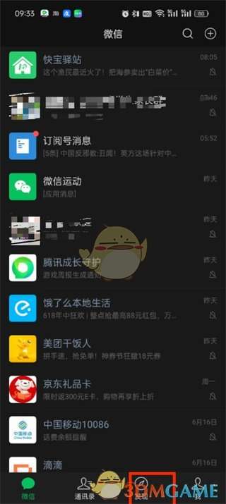 1、首先打开微信软件,进入到首页中后我们可以看到最近的聊天信息,我们需要点击右下方的【发现】按钮;