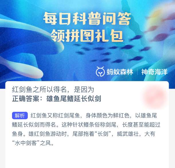 红剑鱼之所以得名,是因为?【神奇海洋】10月22日新题目已开答!正确答案现已公布,点击领取拼图,一起为修复海洋生态贡献力量!今日正确答案是:【雄鱼尾鳍延长似剑】。红剑鱼也叫红剑尾鱼,它们通体鲜红,正是由于雄鱼的尾鳍形状细长如剑,才获得了这个形象的名字。