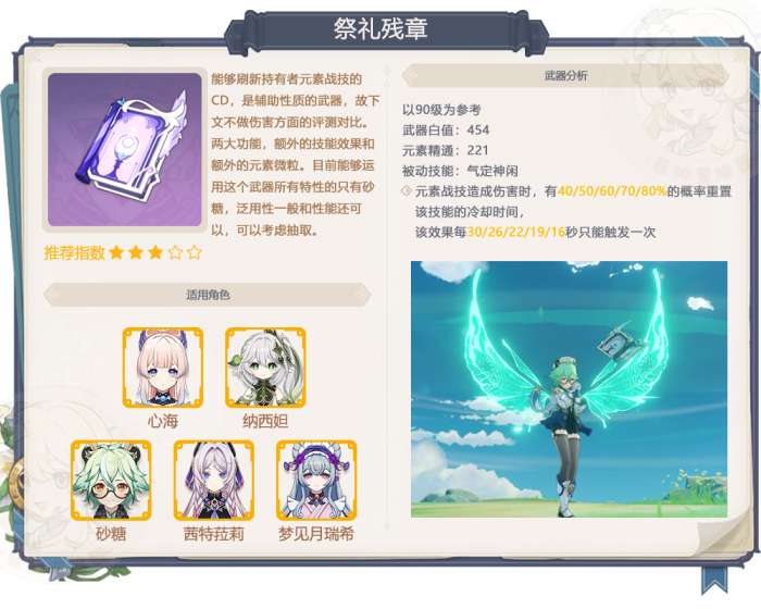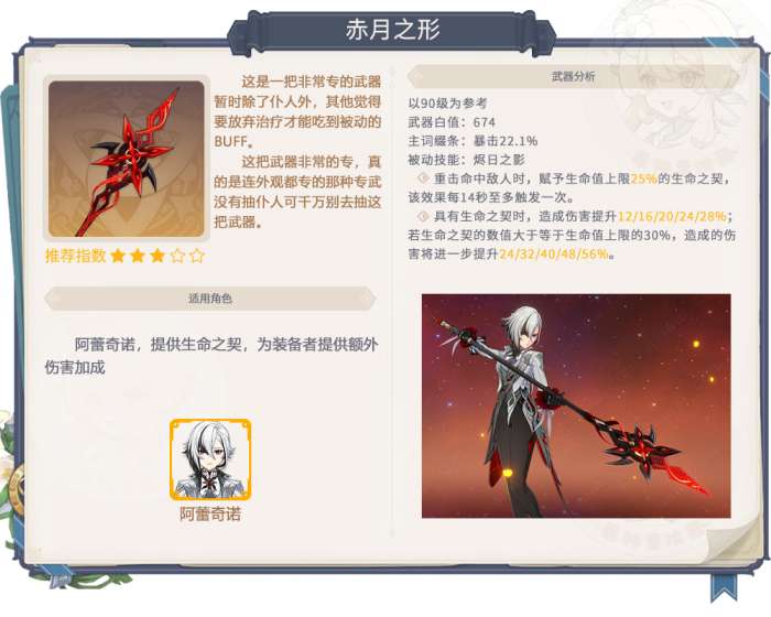 常驻武器,比较不错的精通武器,泛用性不错,但很容易在限定池和常驻池抽到,没必要特意去抽取