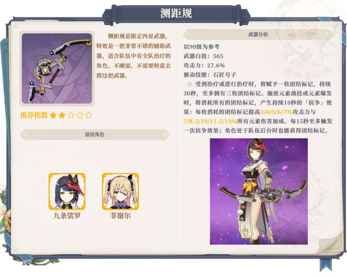 测距规是限定四星武器,特效是一把非常不错的辅助武器,适合队伍中有全队治疗的角色,好用但不刚需,不需要特意去捞这把武器