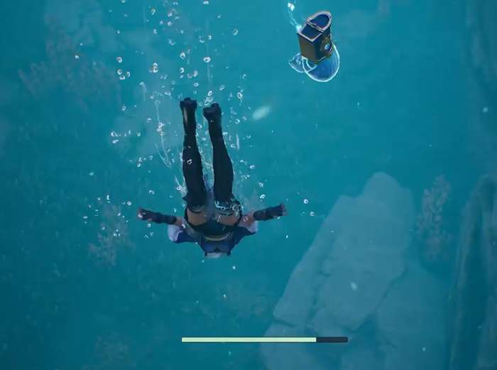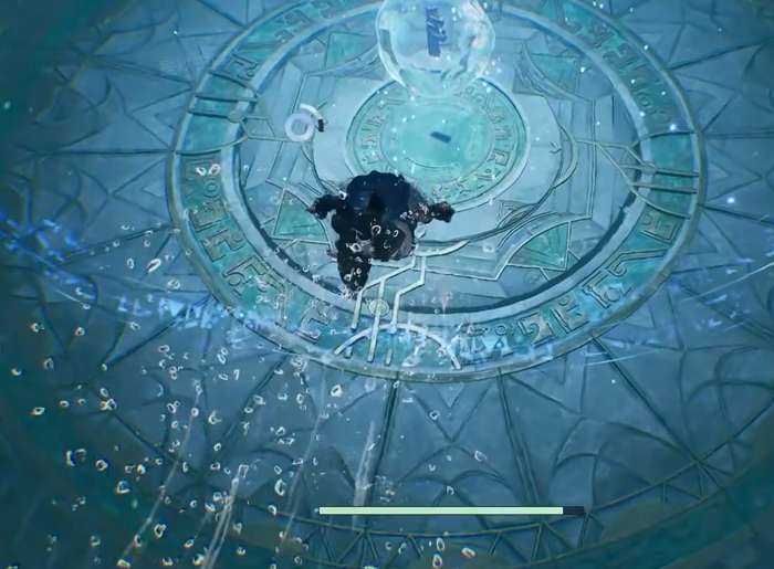 接下来就是重点步骤了。在水域附近会刷新一个宝箱河灵,这个河灵不是用来打的,而是用来引路的。它会自己往水下游,玩家要做的就是跟着它一起潜水下去。一些玩家可能会想着,自己随便找个地方潜下去,但其实跟着河灵走是最保险的方法,因为它会直接带你去正确的位置。