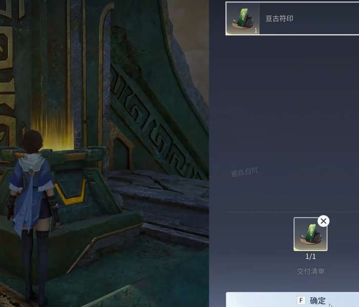 潜入水下之后,视野可能会变得有点暗,这时候要注意调整一下视角。往下游一段距离,就能看到水底有个祭坛的建筑。这个祭坛不算特别大,但是在水下还是比较显眼的,周围会有一些发光的装饰物。游到祭坛正中间的位置,就会出现一个可以交互的提示,点击之后,就能直接解锁亘古符印了。