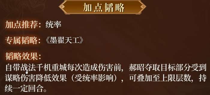 然后是郝昭的专属韬略,叫《墨翟天工》。这个韬略是配合他的自带战法一起发挥作用的。具体效果是,千机重城每次造成伤害之前,郝昭会从目标那里夺取一部分受到谋略伤害降低的效果,这个效果受统率影响,可以叠加到上限层数,持续若干回合。说得直白一点,就是敌方武将原本有一些谋略减伤的能力,郝昭可以把这部分剥过来给自己用。这样一来,敌方更容易被谋略打痛,郝昭自己也变得更抗揍。进攻和防御都往上走了,韬略的收益还是挺实在的。