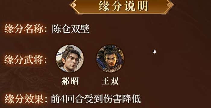 缘分这块,郝昭有一个叫陈仓双壁的组合,搭档是王双。这两个武将凑在一起,前四回合受到的伤害会降低。开局阶段是最容易被对面集火的时候,这个缘分效果顶在最需要的地方,帮助阵容撑过危险期。郝昭和王双本身都是偏防御方向的武将,这个缘分搭起来,整体防御厚度很可观。