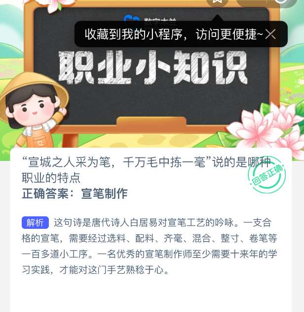 “宣城之人采为笔,千万毛中拣一毫”说的是哪种职业的特点?这是支付宝蚂蚁新村2025年7月25日题目,每天在蚂蚁新村答题,可以提高木兰币的产速,帮助小镇建设。点击正确答案,会获得“产速+3/时”更多的奖励。今天正确答案是【宣笔制作】。“宣城之人采为笔,千万毛中拣一毫”这句诗是唐代诗人白居易对宣笔工艺的吟咏。