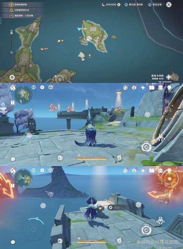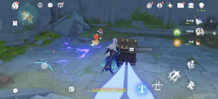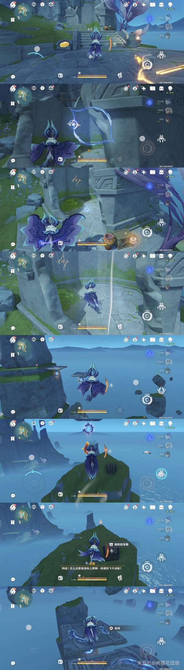魂附暝视龙,往北边走,长按技能对准遗迹涂鸦,将创生物件放置在地上产生风场,借助风场飞到上方平台(平台会自动上升),可顺便获得一个火神瞳和一个精致宝箱,借助第二层平台到达机关处,启动机关
