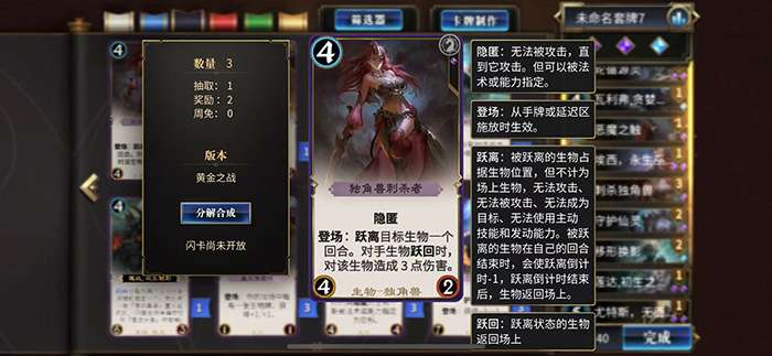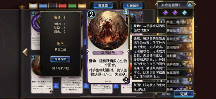 4、空间陷阱和独角兽刺杀者是用来解巨人和烦人的死灵,还起到了拖慢节奏的作用,死灵套一般中期爆发,前期遇到难解的生物或者盾直接跃离,平时抽到放手里就好。但是遇到很多生物在场就比较无力了