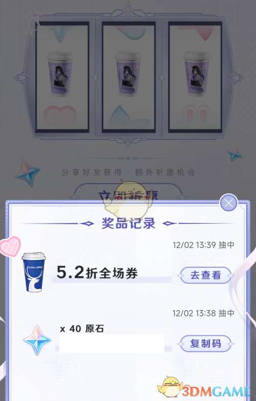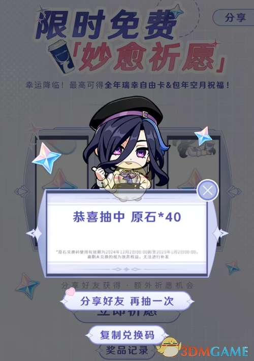 2、奖池内的奖励物品是随机发放的,运气好的玩家可以祈愿获得原石兑换码;