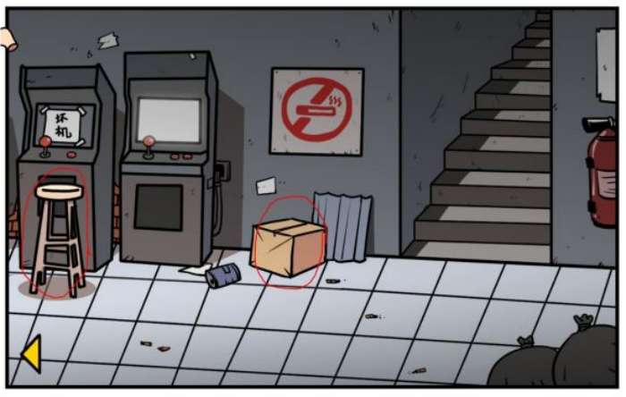 向右切换场景,在纸箱里找到代币2,同时收集坏机前的凳子