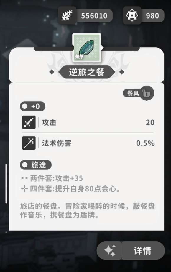 旅途套包含了逆旅之餐、旧乡之音、漫游之记、风雨之信、远行之心、怀人之赠等物品,这套装备就如其名字一样非常,每个物品虽然都有着极为诗意的名字,可是装备自身的能力也是绝对不弱,比如说逆旅之餐,这个物品装备上以后能够增加20点的饿法术攻击,法伤伤害也会提升0.5%,若是装备上两件该套装物品的话,那自身的攻击力就能增加35点,穿戴两件,还能提高80点的会心。