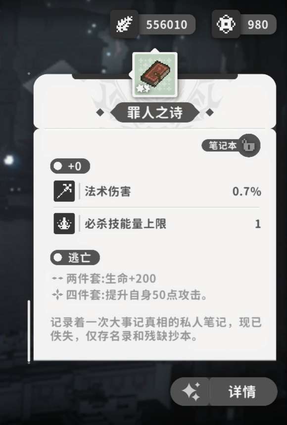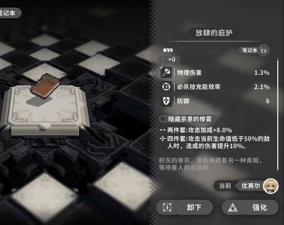 暗藏杀意的惨雾这套界牌是一套能够增加玩家物理攻击以及必杀技能充效率的装备,玩家若是装备上该套种的2件物品,攻击加成可以提高8%,穿戴4件套的话,当玩家去攻击生命值不足50%的敌人时,给敌人造成的伤害将会提升10%,大家在收集该套物品时,建议大家优先去收集笔记本放肆的庇护、书签行凶的预告、怀表未眠的等待等物品,这些物品在装备上以后,角色自身的物理伤害都将会得到显著的提升。