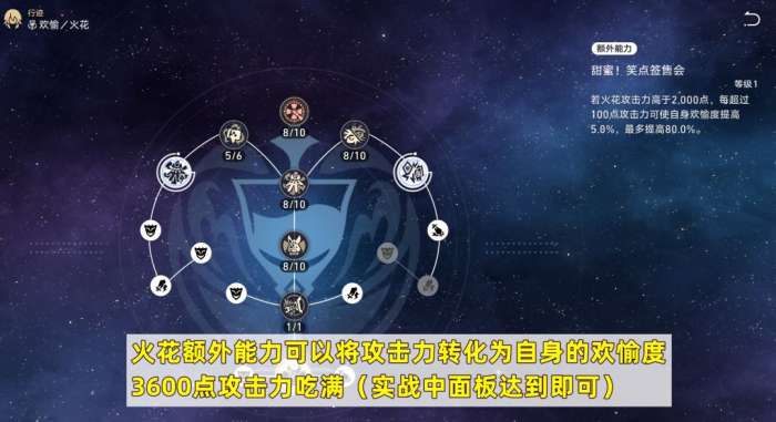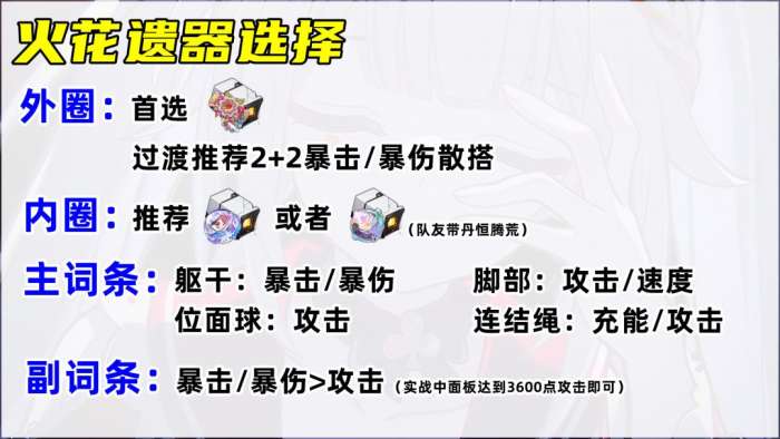 不过火花的额外能力可以将攻击力转化为自身的欢愉度,3600点攻击力吃满(实战中面板达到即可)。因此词条还是优先堆双暴和攻击力。