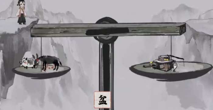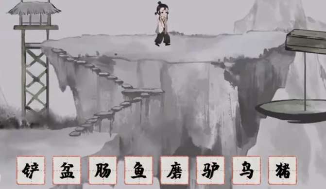 《栖云异梦:梦蝶》第五关“人烟”需在老伯处收集【铲】、【盆】等六件物品,在眺望台与平台分别获取【鸟】与【猪】。解开天平谜题:左盘放【鱼】和【铲】,右盘放【盆】。随后取走【铲】备用,并用【炊】拆出的【火】烧掉拦路木头。最后将【铲】与【肠】拆解组合为【钥】,为小女孩打开大门即可通关。