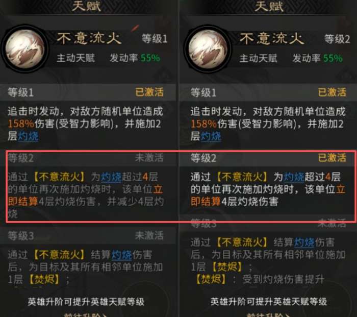 本次测试中,陆逊的增强可谓一次关键性机制调整。其2阶段天赋得到显著优化:旧版本中,通过天赋提前结算4层【灼烧】时会减少4层【灼烧】,而新版本改为不减少【灼烧】层数。