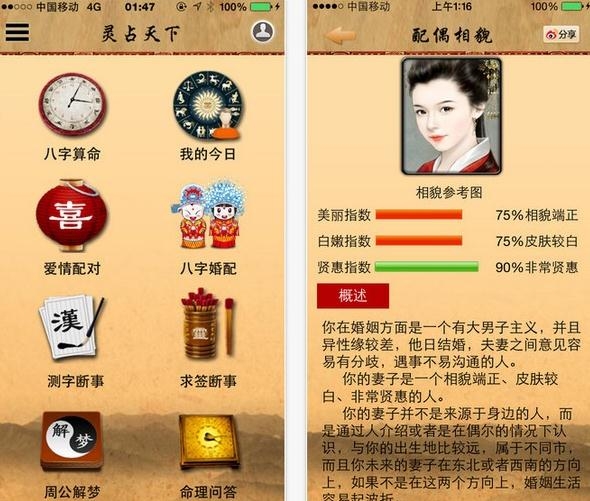 灵占天下算命是一款简洁易用,极具中国风的占卜应用,是最受用户欢迎的占卜算命应用之一,它以中国五千年来所传承的周易人文思想告诉您命理变化的秘密,为您晓通命运,决断未来之事起重要帮助。