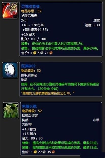 术士的任务奖励也不太好。虽然深渊碎片的效果不错,无奈冷却时间太长,仅某些场景下能配合牺牲使用。灵魂收割者效果也不咋滴,但是外观帅啊,好歹也是怀旧服里仅有的一把镰刀外观。输出是一个版本的,帅是一辈子的。