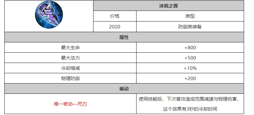 以上就是王者荣耀中装备冰痕之握的介绍了,冰痕之握也是适合坦克出的装备,可以提供大量的生命、法力以及冷却缩减,非常全面。更多王者荣耀精彩攻略,可以关注PK手游网!