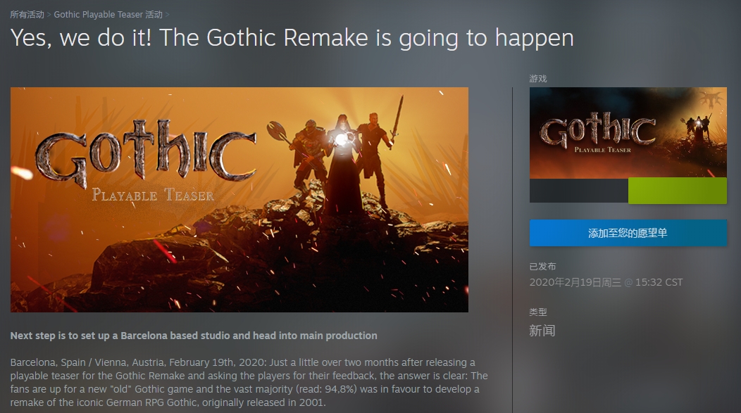 随着魔兽世界一波怀旧服的回忆杀,各大游戏厂商纷纷效仿此法。许多单机和老作的怀旧重制版也开始加速。了THQ Nordic于2019年12月14日在steam商城上架了一款名为《哥特王朝:试水版》的游戏,免费赠送给所有拥有系列游戏之一或Piranha Bytes开发任一游戏的玩家,来为系列新作探路。