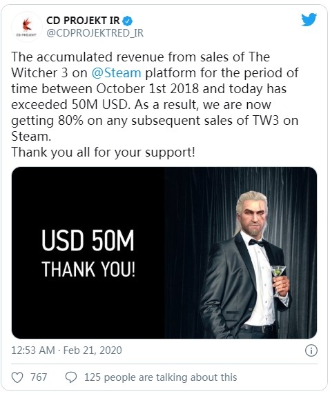 简而言之, 在这三年时间内,《巫师3》又获得了5000万美元的收入,这也说明了该作魅力是多么大。现在CDPR可以从《巫师3》后续销售收入中获得80%的收益了。而Steam销售默认抽成是30%,这意味着Steam对《巫师3》销售抽成下调至20%了。
